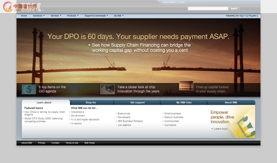 另外我們還可以看到IBM這次新的設(shè)計比原來的設(shè)計更有立體感,這就是我上面所說的元素層次。這種層次感拉開了瀏覽者的視覺深度,使得我們的網(wǎng)頁不再平面。雖然也不是3D的效果,但是我相信2D的效果必然會成為網(wǎng)頁設(shè)計的一個新的趨勢。通過2D模擬出視覺立體感,會使得網(wǎng)頁設(shè)計更有張力,內(nèi)容也更為豐富。