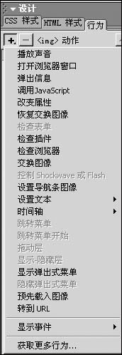 2. 選中圖片,單擊行為標簽,在此面板中,點擊“增加事件”按鈕,出現(xiàn)下拉菜單,如圖所示。
