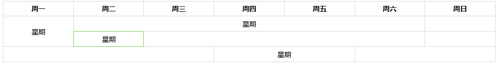 <!DOCTYPE html> <html> <head> <meta charset="utf-8"> <title>border-hover</title> <style type="text/css"> .w1000{width:1000px;margin:0 auto;} .table{width:100%;border-collapse:collapse;text-align:center;font-size:14px;} .table tr th{border: 1px solid #d9dbda;padding:5px 0;} .table tr td{border: 1px solid #d9dbda;} .height2{height:61px;line-height:61px;} .height1{height:30px;line-height:30px;} .table tr td:hover .list-div{position:relative;} .table tr td:hover .list-div:after{ content: ""; height: 100%; left: -1px; position: absolute; top: -1px; width: 100%; z-index: 100; } .table tr td.list01-td:hover .list-div:after{ border: 1px solid #b1bac6; } .table tr td.list02-td:hover .list-div:after{ border: 1px solid #76ca5a; } .table tr td.list03-td:hover .list-div:after{ border: 1px solid #ff9600; } </style> </head> <body> <div class="w1000"> <table class="table" cellpadding="0" cellspacing="0" > <thead> <tr> <th>周一</th> <th>周二</th> <th>周三</th> <th>周四</th> <th>周五</th> <th>周六</th> <th>周日</th> </tr> </thead> <tbody> <tr> <td rowspan="2" class="list01-td"><div class="list-div height2">星期</div></td> <td colspan="5" class="list02-td" ><div class="list-div height1">星期</div></td> <td></td> </tr> <tr> <td class="list02-td"><div class="list-div height1">星期</div></td> <td colspan="4"></td> <td></td> </tr> <tr> <td colspan="3"></td> <td colspan="2" class="list03-td"><div class="list-div height1">星期</div></td> <td colspan="2"></td> </tr> </tbody> </table> </div> </body> </html>